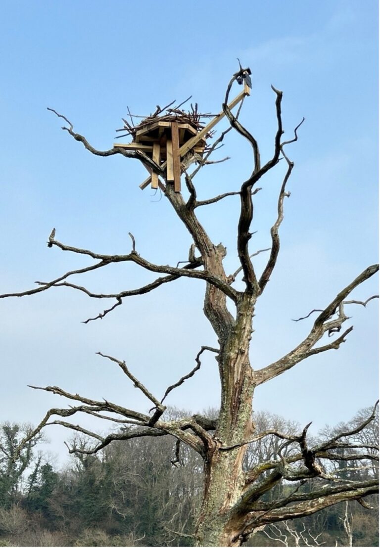Seb from the Devon Osprey Partnership, spent several hours putting his climbing skills to good use 9 metres up a tree while the rest of us offered ground support with a pulley to hoist up materials. The first nesting platform is now in place with a camera installed to catch future Osprey activity.